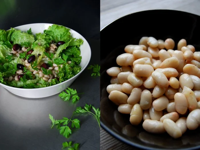 It was only a short visit but we enjoyed every second of it! Now that they left, the flat is quiet again and I feel like some lighter food. I hadn't made any kitchen plans so I had to work with what I found and inspired me, a big lollo bionda lettuce in the fridge, some parsley on the kitchen window sill, a small can of cannellini beans, my Maltese capers and some black Kalamata olives (this jar is never missing in my pantry). All this thrown together in a large bowl and mixed with a light vinaigrette can make two people very happy. You could also add some canned tuna or tomatoes but I found my Saturday snack perfect as it was.
