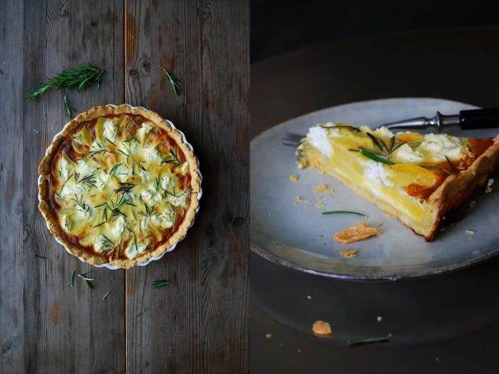 There are quite a few quiche recipes on the blog and I can't stop adding more: there's one with tomatoes and mozzarella, beans and ramp, with leek, one with fennel … Click here for the entire eat in my kitchen quiche collection. Today's recipe feels like a trip to the Provence, at the peak of summer. The potatoes give it a hearty touch - almost like a German quiche - yet the milky chèvre and woody rosemary make it light and take it right back to the Mediterranean.