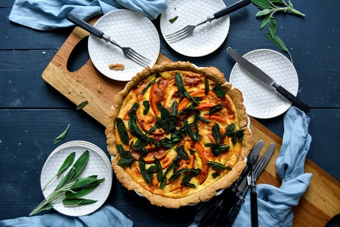 Roll out the dough between plastic wrap then fit the dough into a 30cm / 12” quiche dish, pushing it into the dish. Prick the dough all over with a fork and bake for 15 minutes or until golden. If the dough bubbles up, push it down with a fork. Take the quiche dish out of the oven and reduce the temperature to 180°C / 350°F.