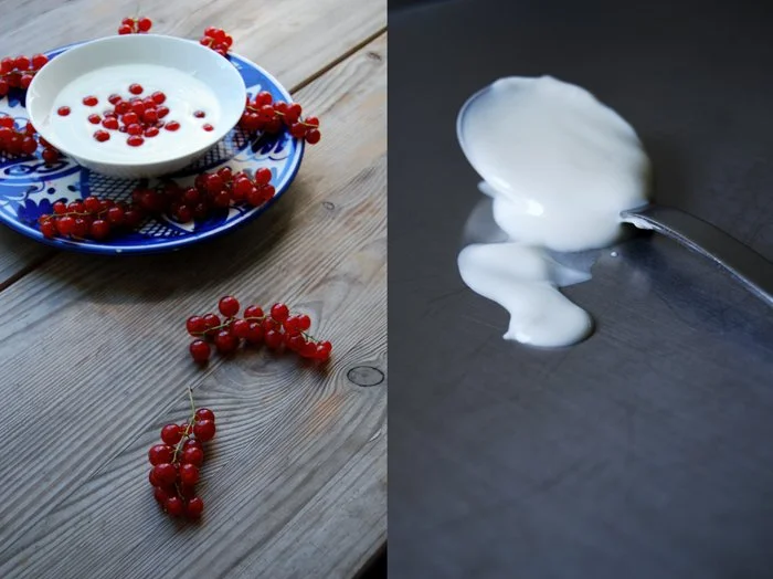 When I prepared my fruits and cream, a friend from Canada popped in my kitchen spontaneously. As soon as she saw the glowing red of the berries her attention moved away from me and towards the fruit. Feasts are there to share, so I handed her a bowl of my creamy yoghurt topped with red currants - she looked happy like a child in a candy store!
