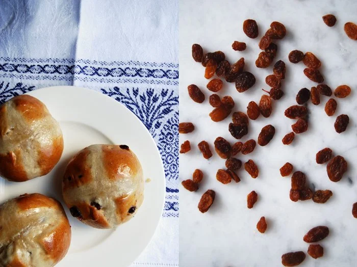For the dough, combine the dry ingredients (including spices and orange zest). Mix the hot melted butter with the cold milk and the egg, this way the liquid mixture will have the right lukewarm temperature (check with a finger). Mix the dry and the liquid mixture with your dough hooks for 5 minutes until well combined. Continue kneading with your hands for a few minutes until you have an elastic dough ball. Mix the raisins into the dough and put it back into the bowl, cover with a tea towel. Let the dough rise in a 35°C / 95°F warm oven for 70 minutes. This works really well but make sure that your oven is set to top/ bottom heat and not to fan.