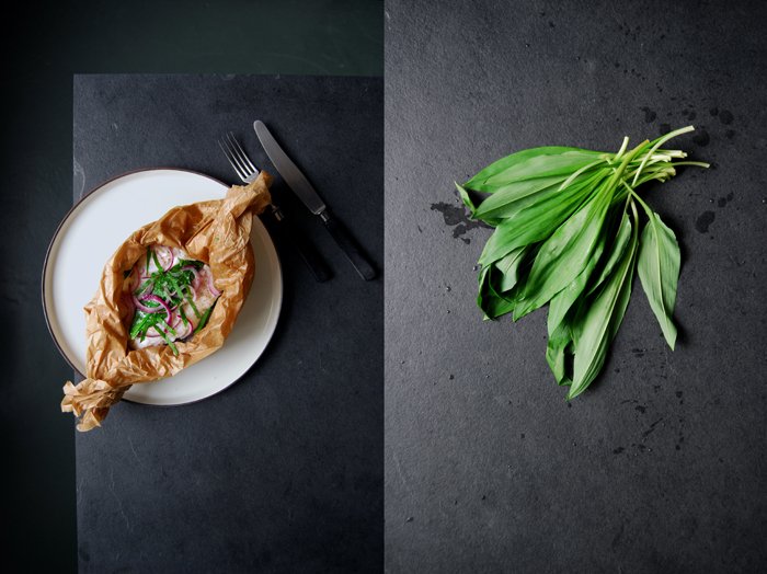 I've been looking for it impatiently over the past few weeks and when I finally spotted the first bunch at my organic supermarket I had to call my boyfriend instantly, he's almost more obsessed with these green spring leaves than I am. We changed our dinner plans from gnocchi with blue cheese sauce to spaghetti with pesto, and that was just the beginning of our re-awakened green passion! Cod al cartoccio on a bed of ramp and red onions was next on my list. It's not only very delicious but also a very convenient match. I wrapped the fish in a parchment paper package with a little white wine, olive oil and lemon juice and cooked it in the oven for 15 minutes, all in all it took less than half an hour including the preparation! If you're still looking for a light and easy family Easter lunch, think al cartoccio. It cooks the fish to perfection while you can create your desired aroma of herbs and vegetables, it tastes divine and looks beautiful on the table.